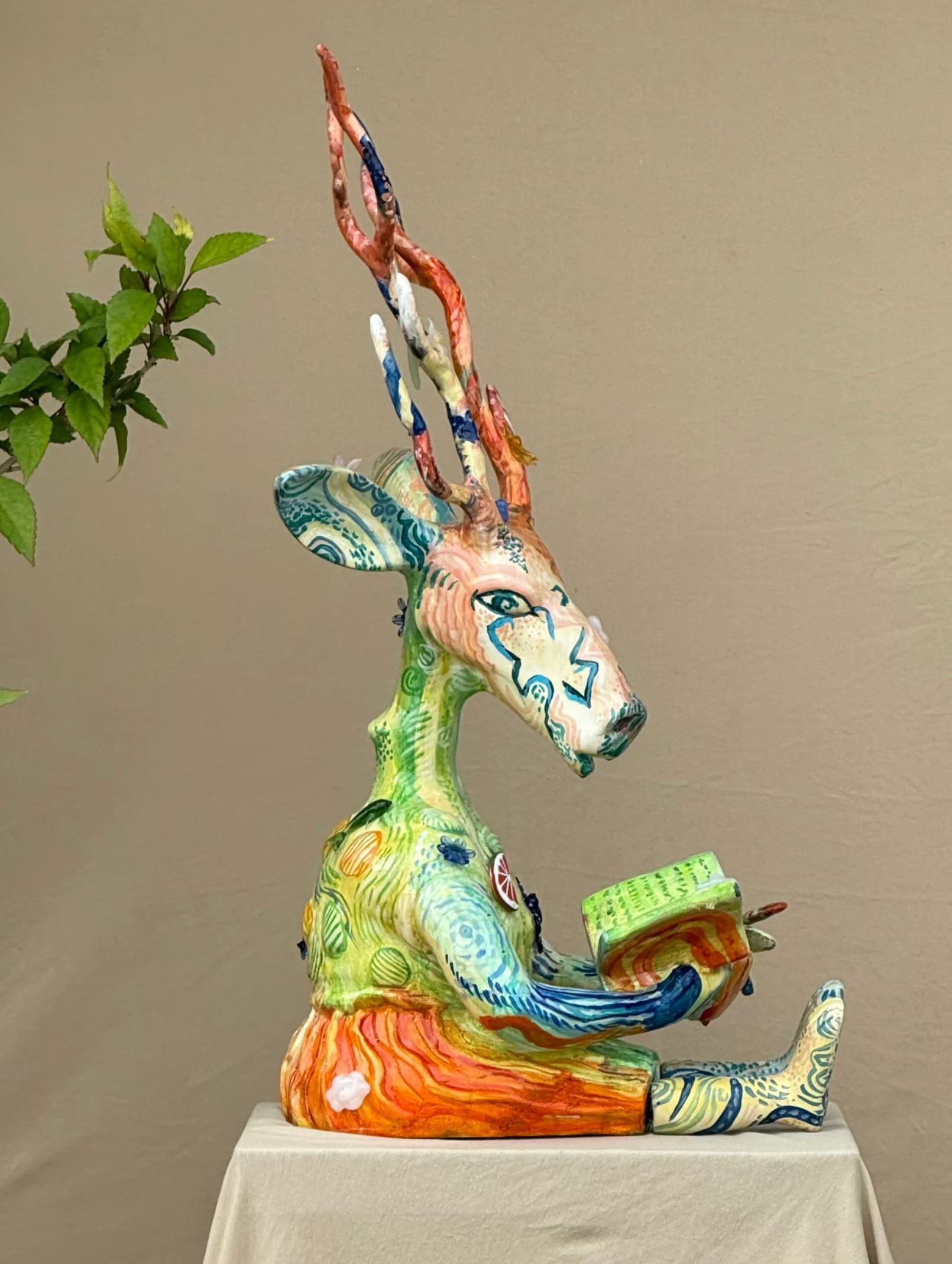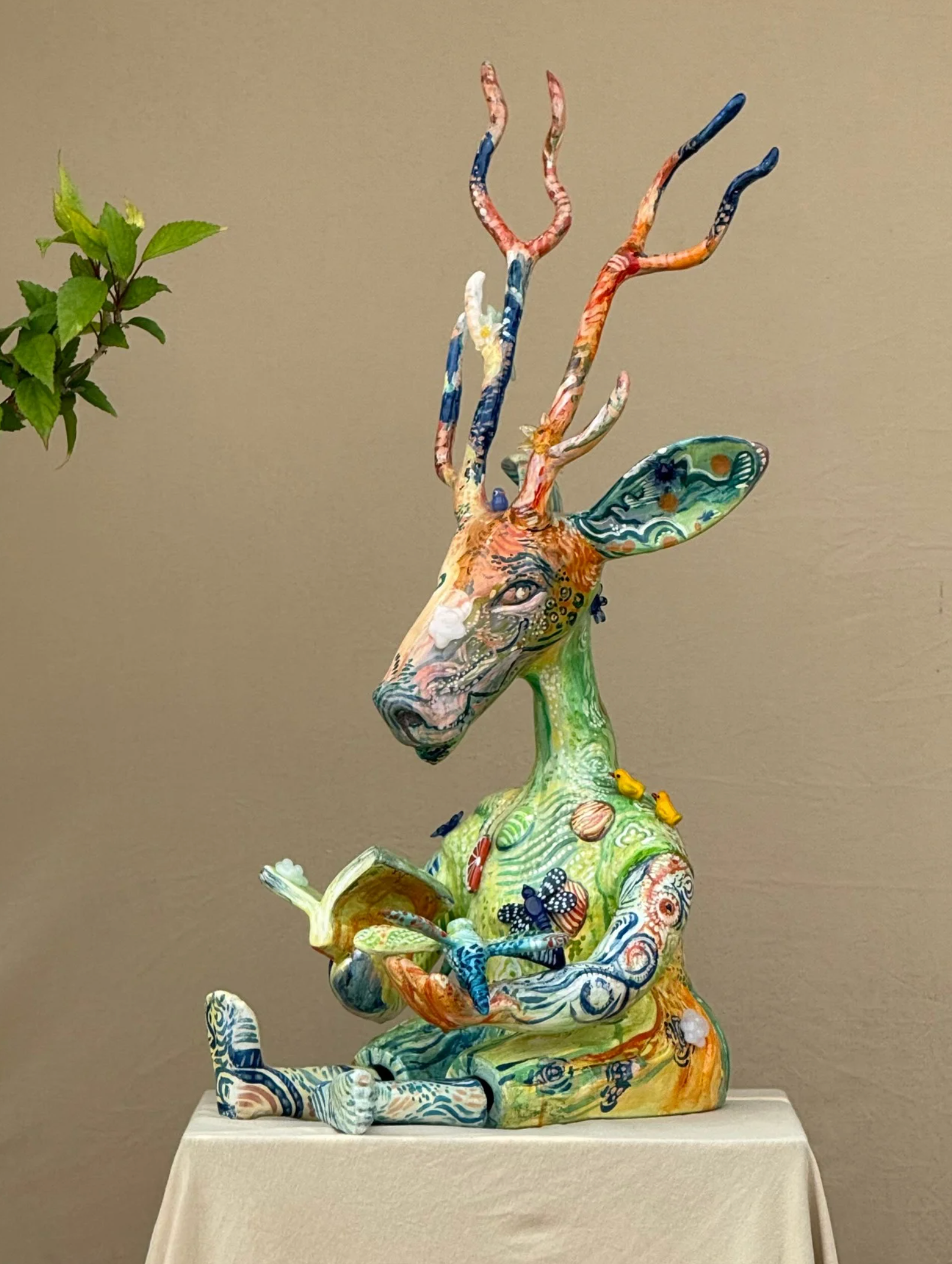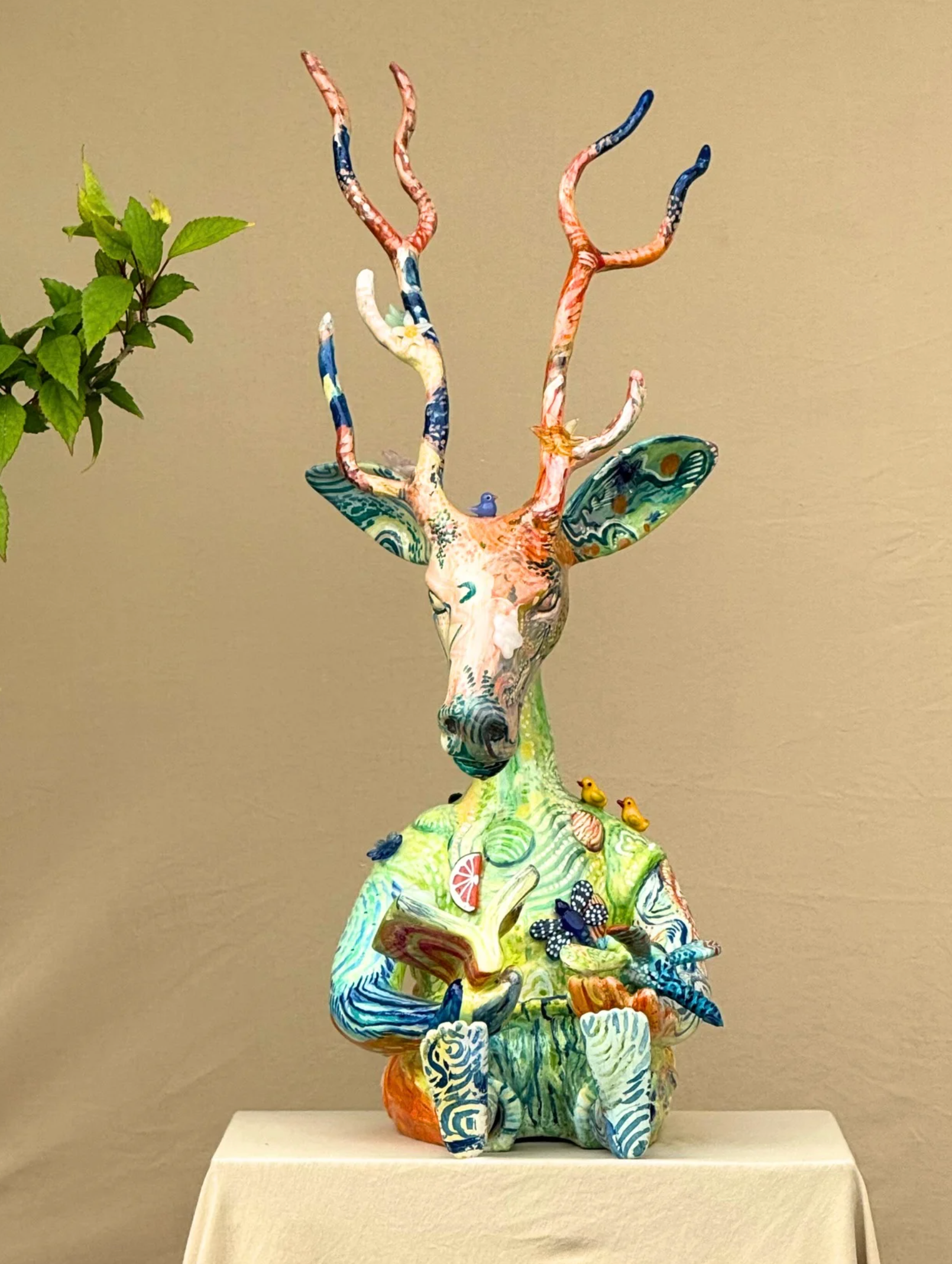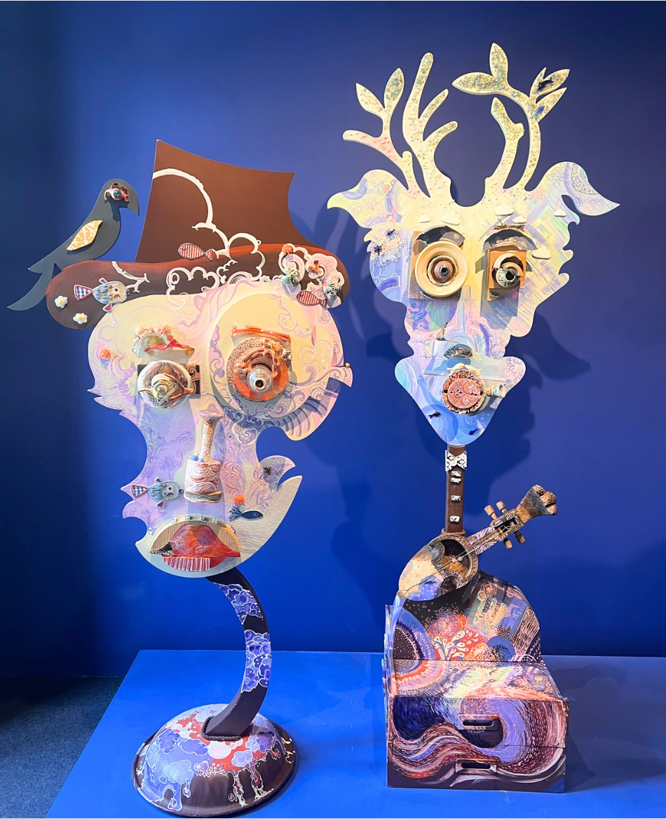 Whimsical, bold, and unapologetically surreal, Serendipiti is a sculptural ensemble commissioned by Serendipity Arts Festival, Goa, that celebrates the joyful unpredictability of creative discovery. Composed of five fantastical totem-like figures, each form merges human facial features with dreamlike creatures, objects, and motifs—birds, moons, antlers, musical instruments—all layered in vibrant textures and kaleidoscopic colors.