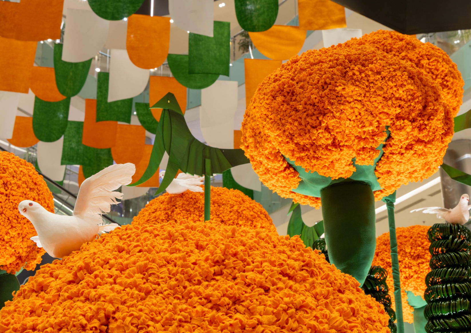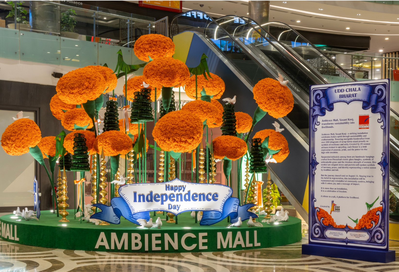 This independence day, Design met impact. Fearless hues of saffron represent the nation’s strength & grace. an evocative installation, a field of larger-than-life marigolds, standing tall and proud. Meticulously handcrafted from over 200 kilograms of scrap fabric, each marigold is a bold, blooming testament to India’s resilience, unity and the power of standing tall and flying high. This initiative was designed to honour India’s freedom and create it, by providing livelihood, promoting sustainability, and supporting women at the grassroots.