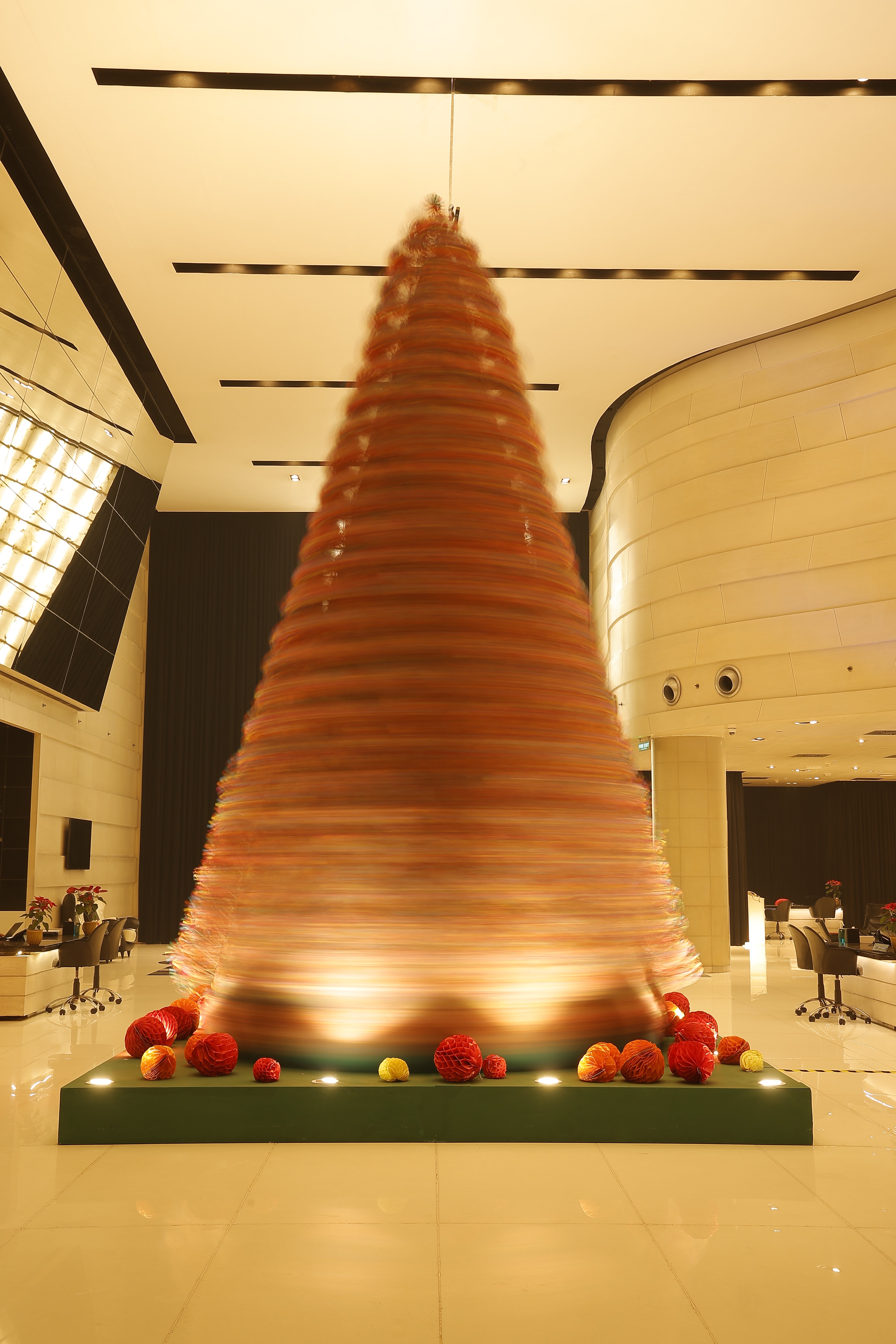 A sustainable Christmas tree crafted from 5,000 vibrant paper fans, celebrating the joy of life in all its big and small moments. Inspired by the nostalgia ofa mela and the childhood memories of festive cheerand innocence, the tree brings to life the laughter and colors of celebration. Supporting 70 Indian artisans, the installation highlights their craftsmanship and livelihoods, with a message of sustainability and cultural heritage. Conceptualized and designed by Nehmat Mongia, this installation embodies the timeless spirit of joy.