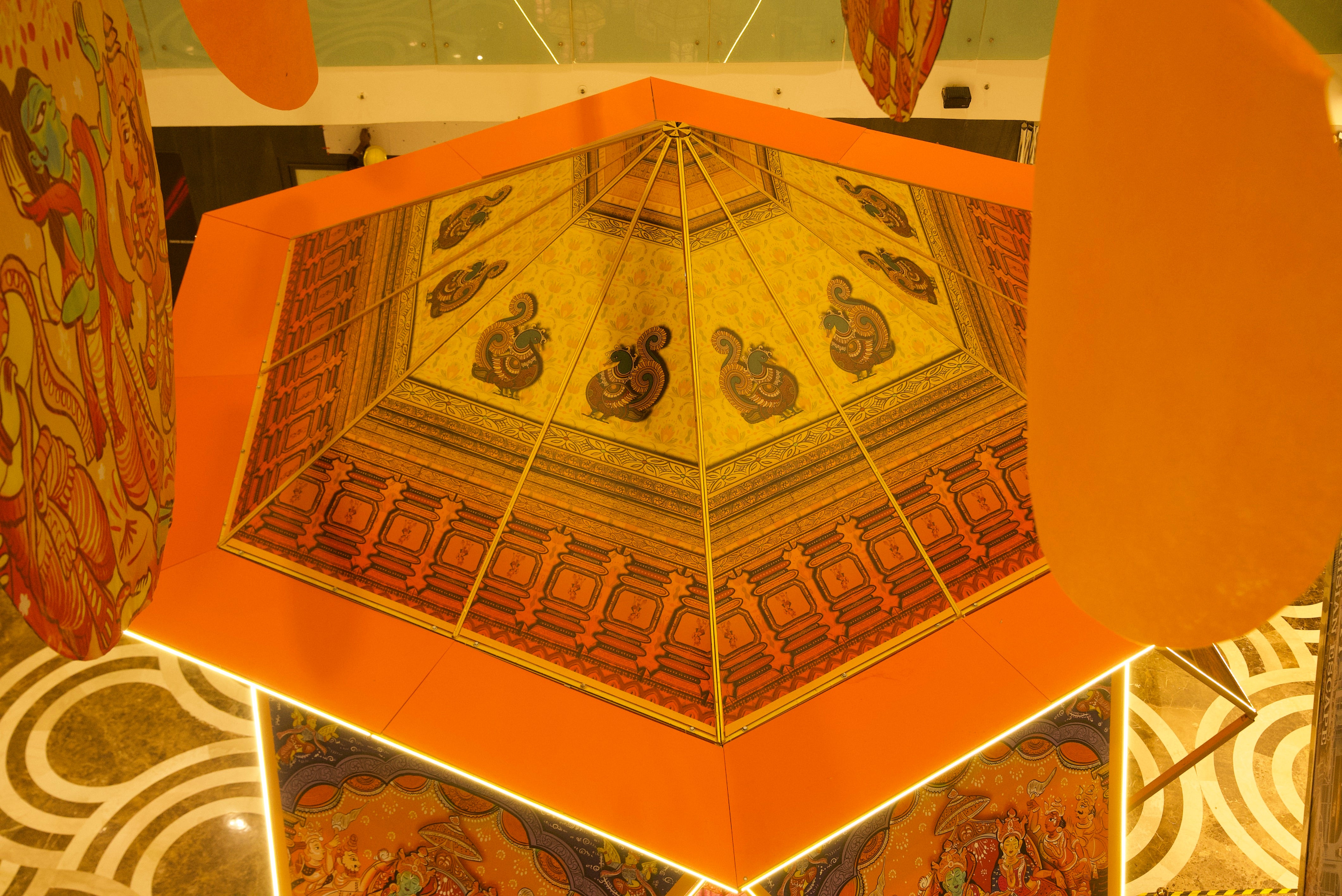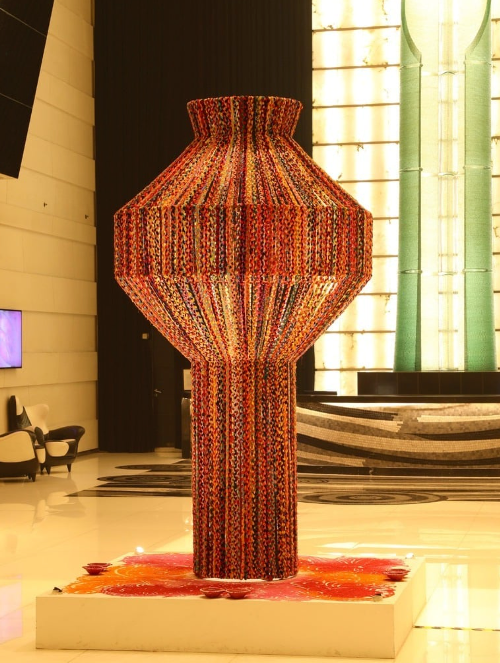 celebrates tradition with a magnificent 30-foot installation of Lord Ganesha remover of obstacles, harbinger of wisdom, and bringer of prosperity. Envisioned as a radiant symbol of abundance and devotion, it reflects new beginnings, positivity, and good fortune. The grandeur is further enhanced with shimmering Lippan craft from Kutch, adding timeless artistry to the festive spirit.