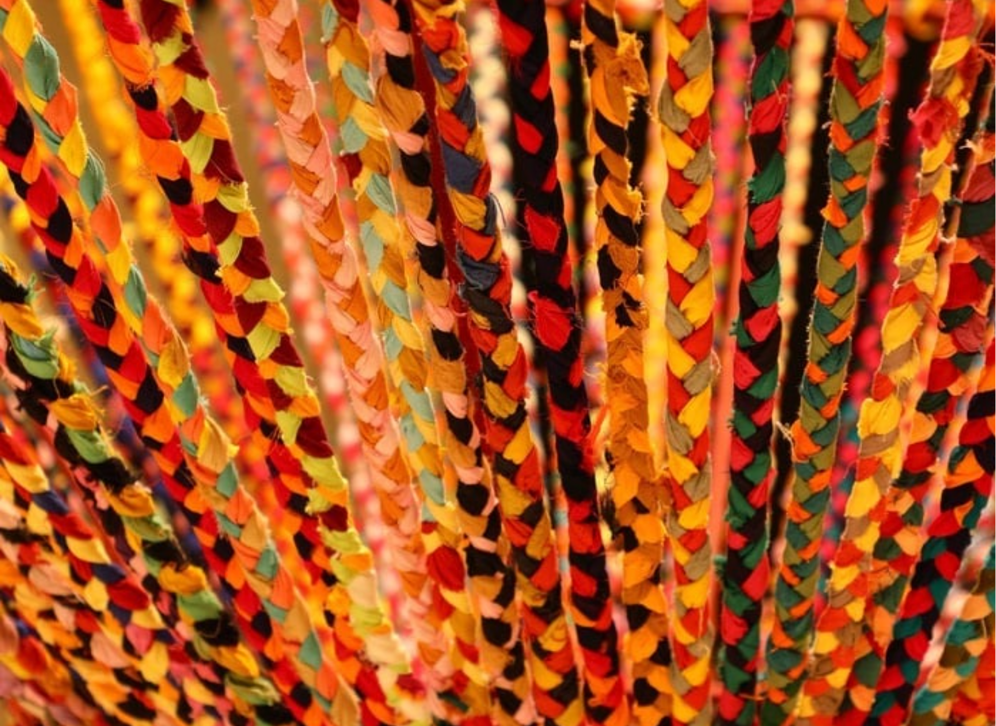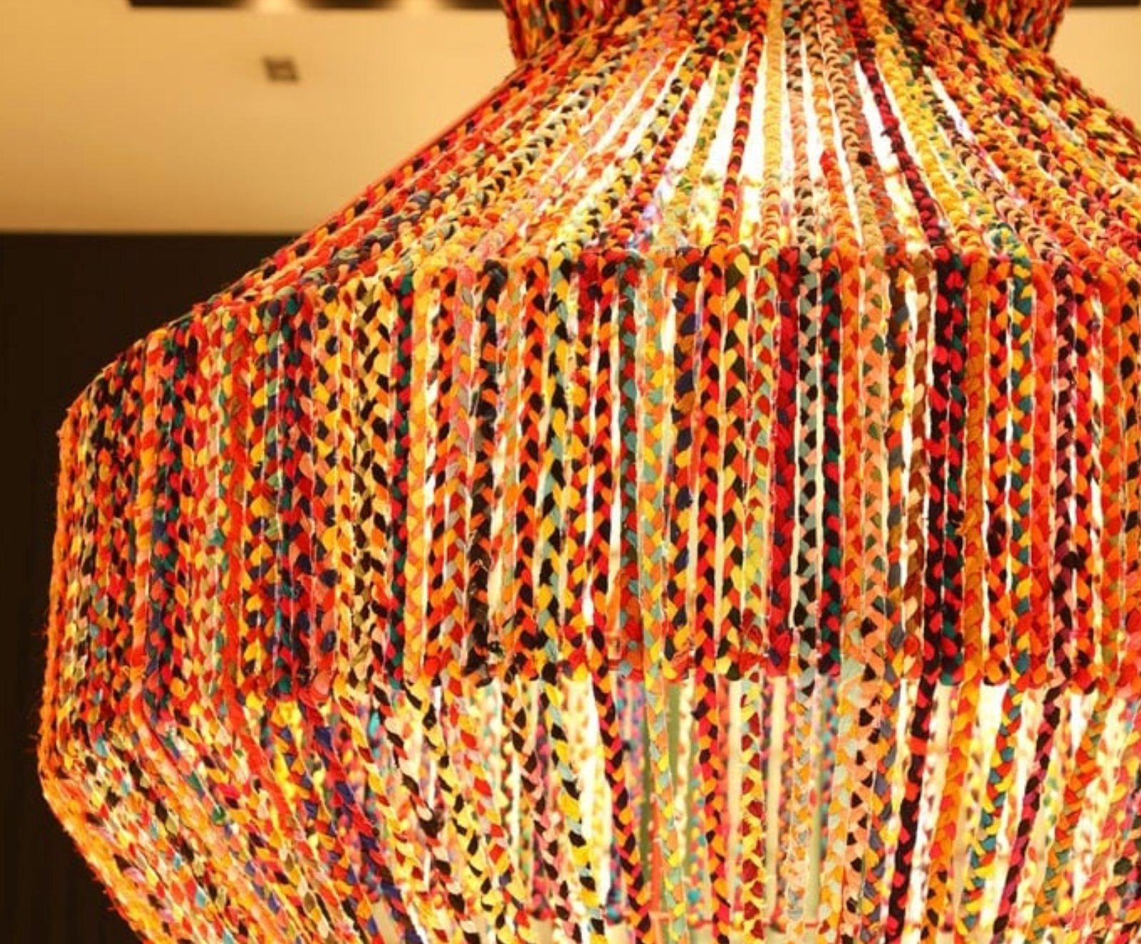 Collaborating with a village in Haryana known for transforming scrap saris into thread, we utilized this sustainable material to craft a grand handolla