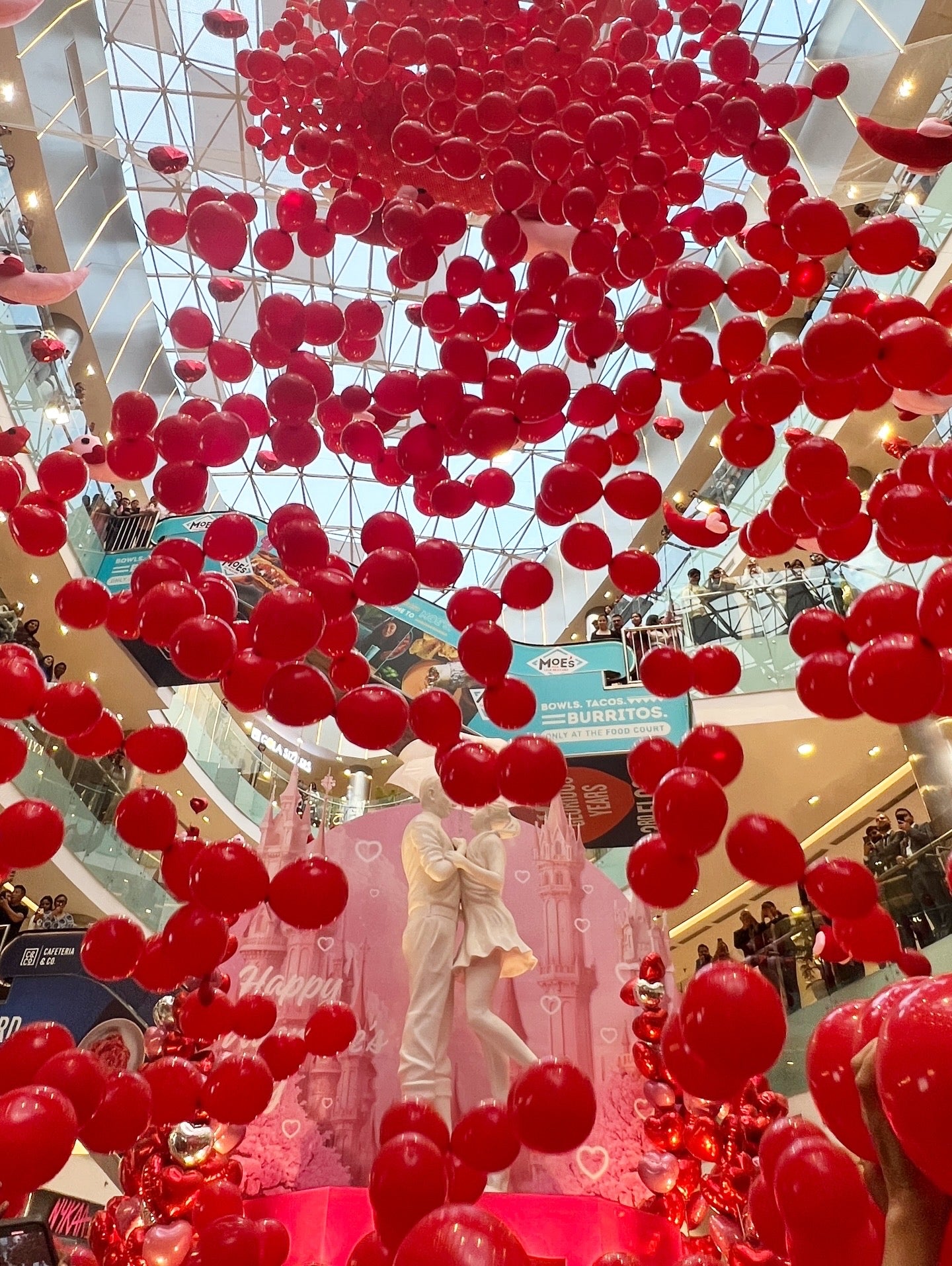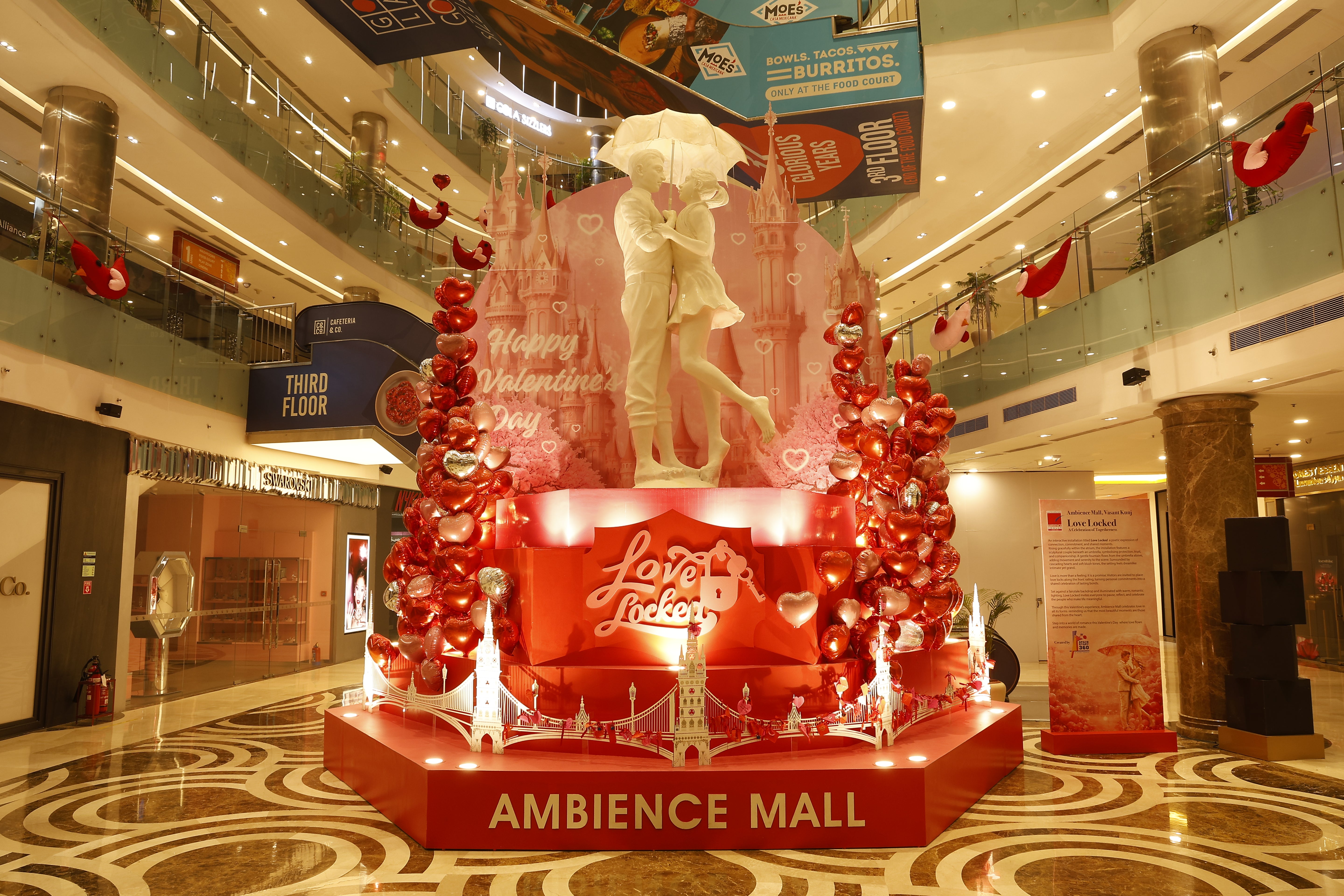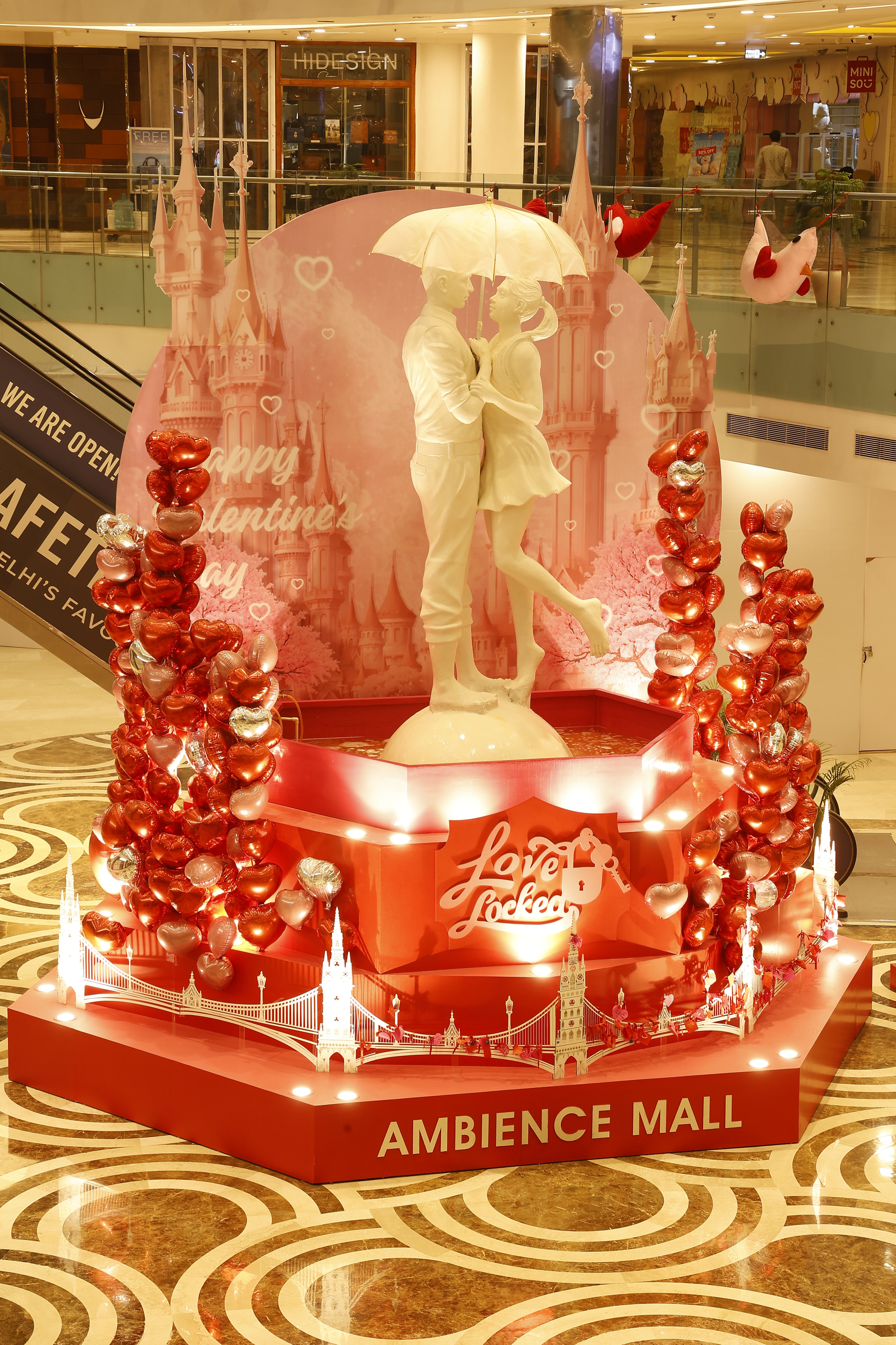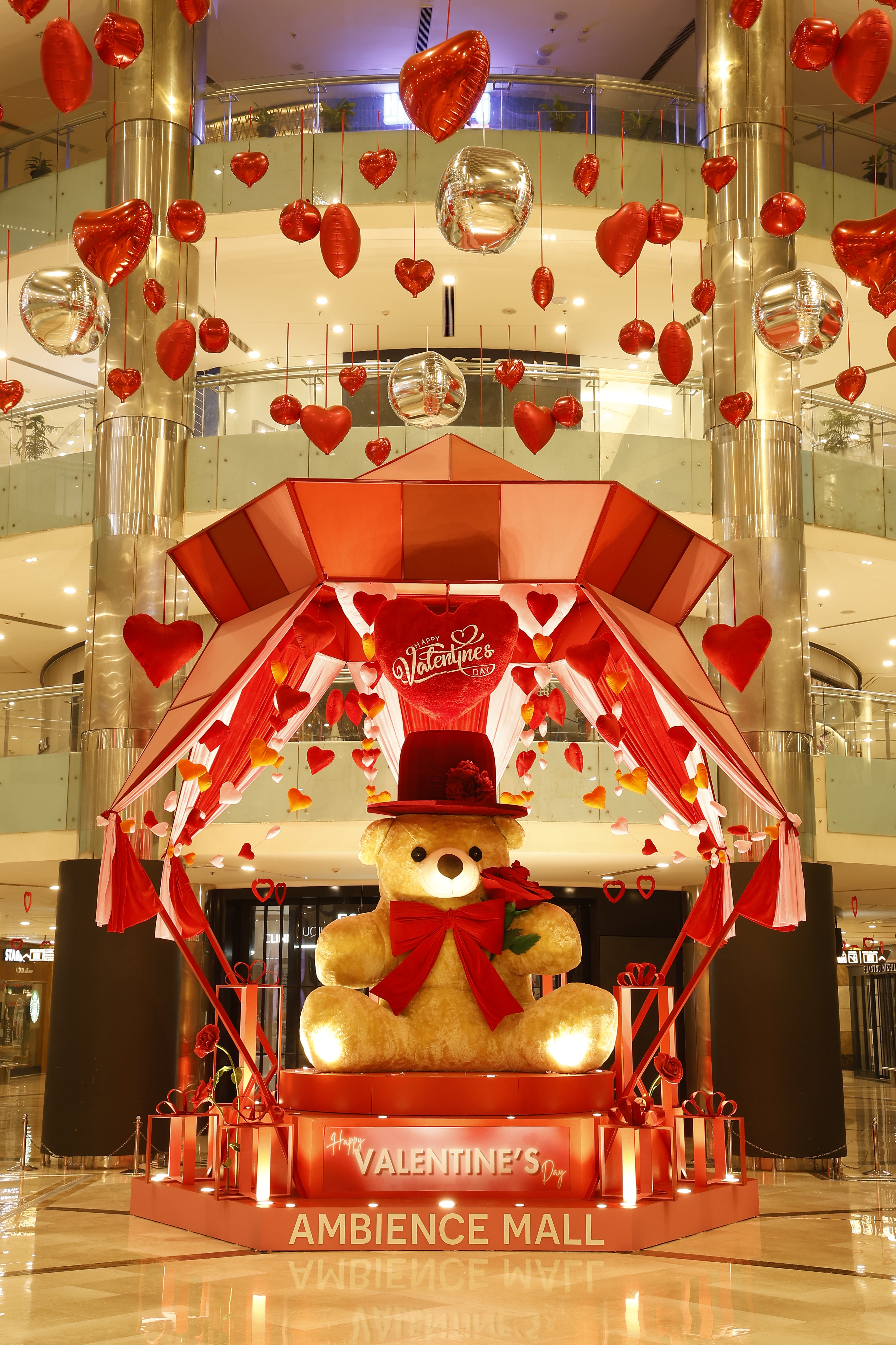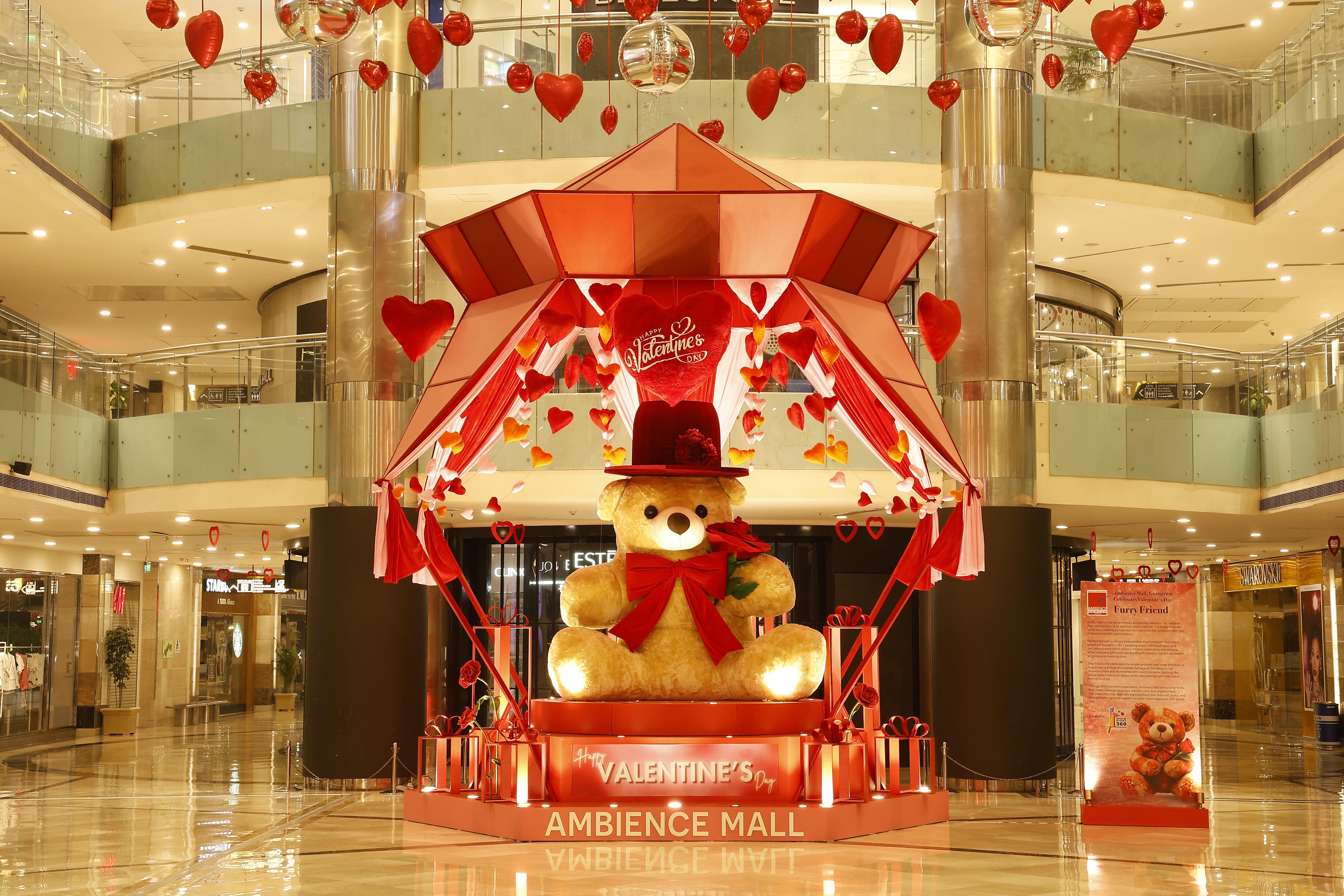 This Valentine's Day installation celebrates love in its most playful and heartwarming form. At the center, a larger-than-life teddy bear holding a rose symbolizes innocence, affection, and heartfelt emotions.