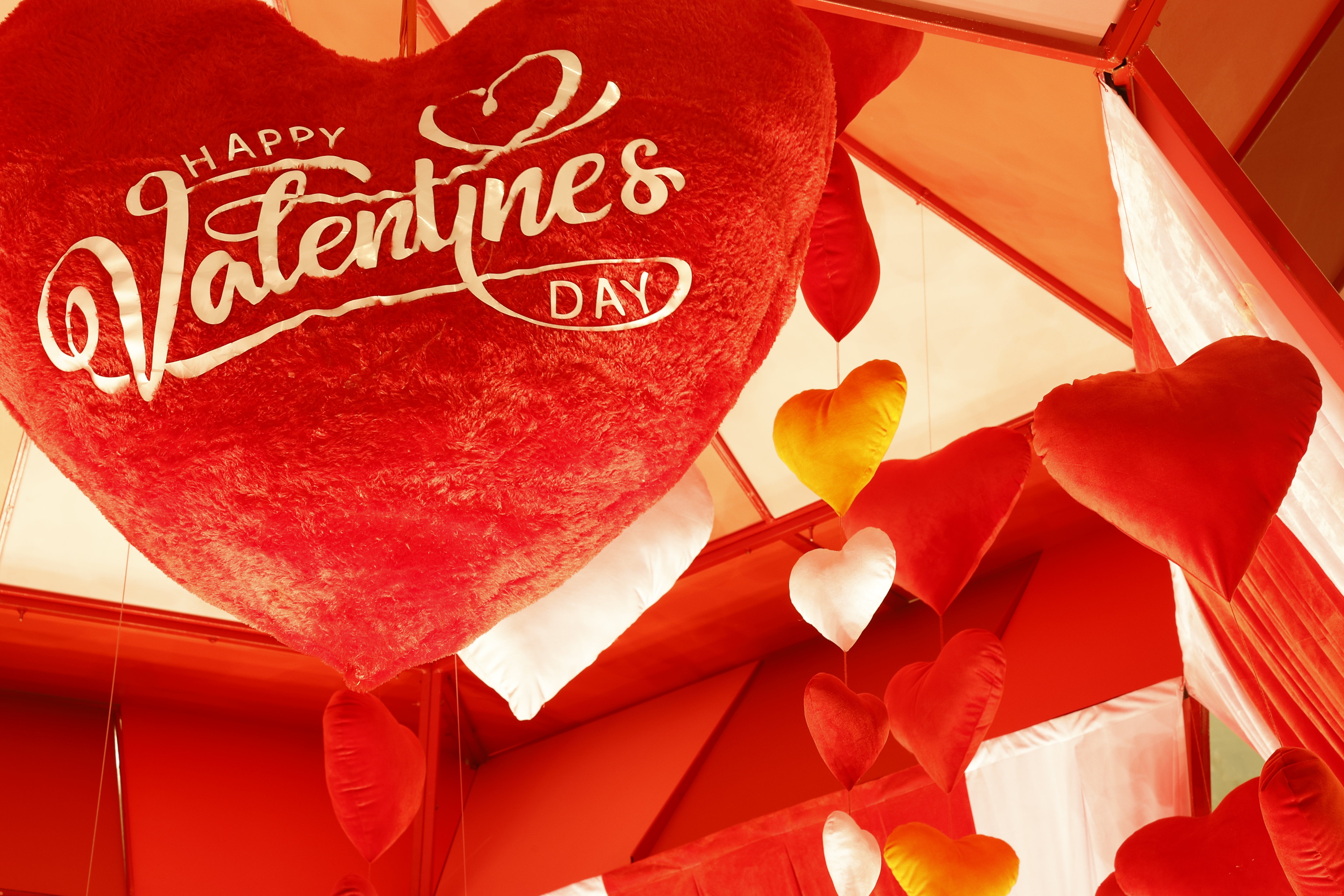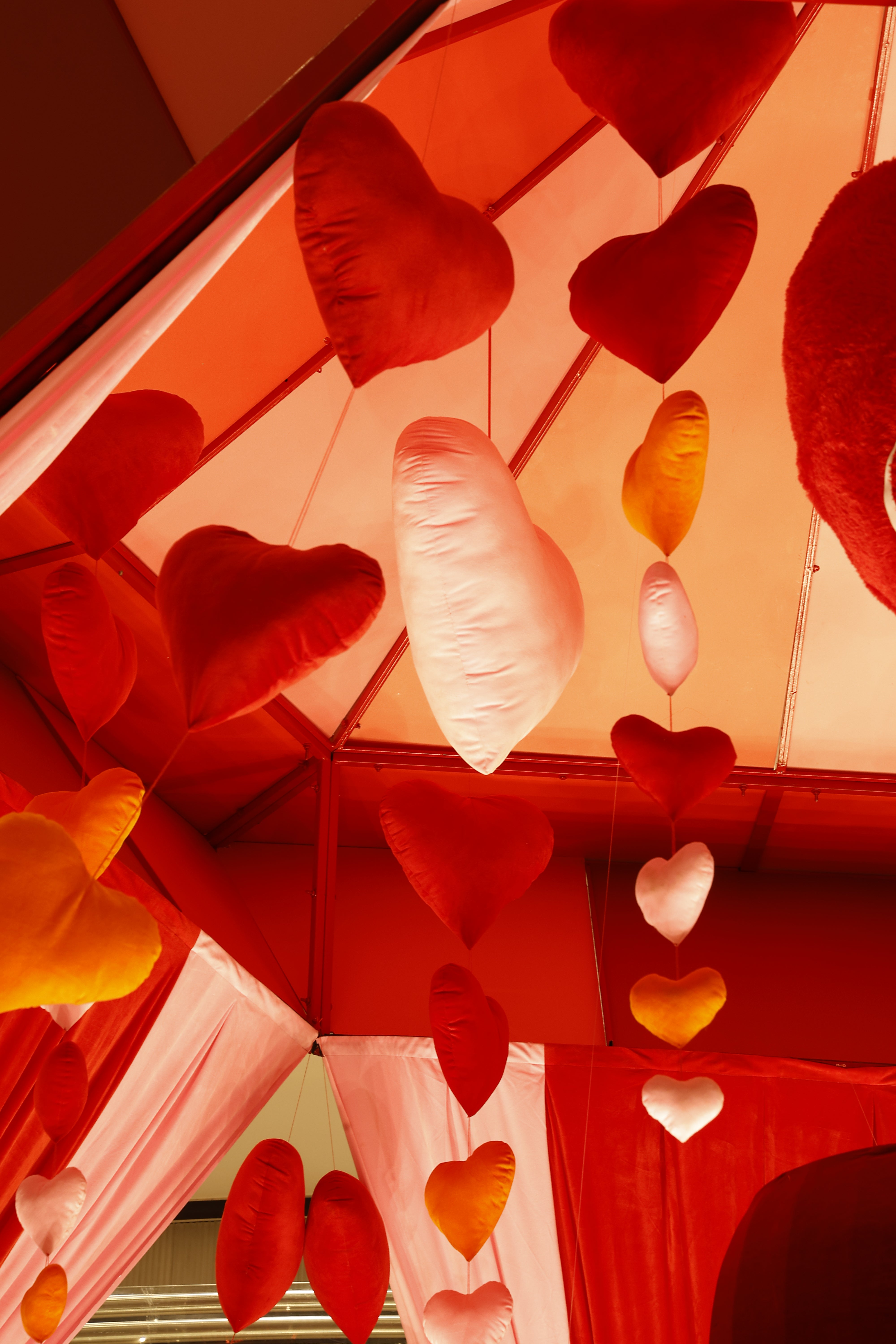 Framed within a romantic red and pink draped canopy with cascading hanging hearts, the installation creates an immersive and visually striking experience. Warm lighting and illuminated signage enhance the festive mood, making it a perfect photo destination for visitors.